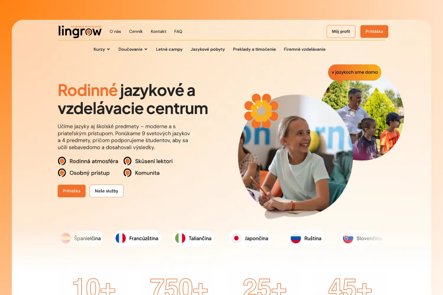 Pre Lingrow sme vytvorili modernú webstránku, ktorá prehľadne prezentuje kurzy a doučovanie. Dizajn je intuitívny a podporuje jednoduchý kontakt aj registráciu študentov.